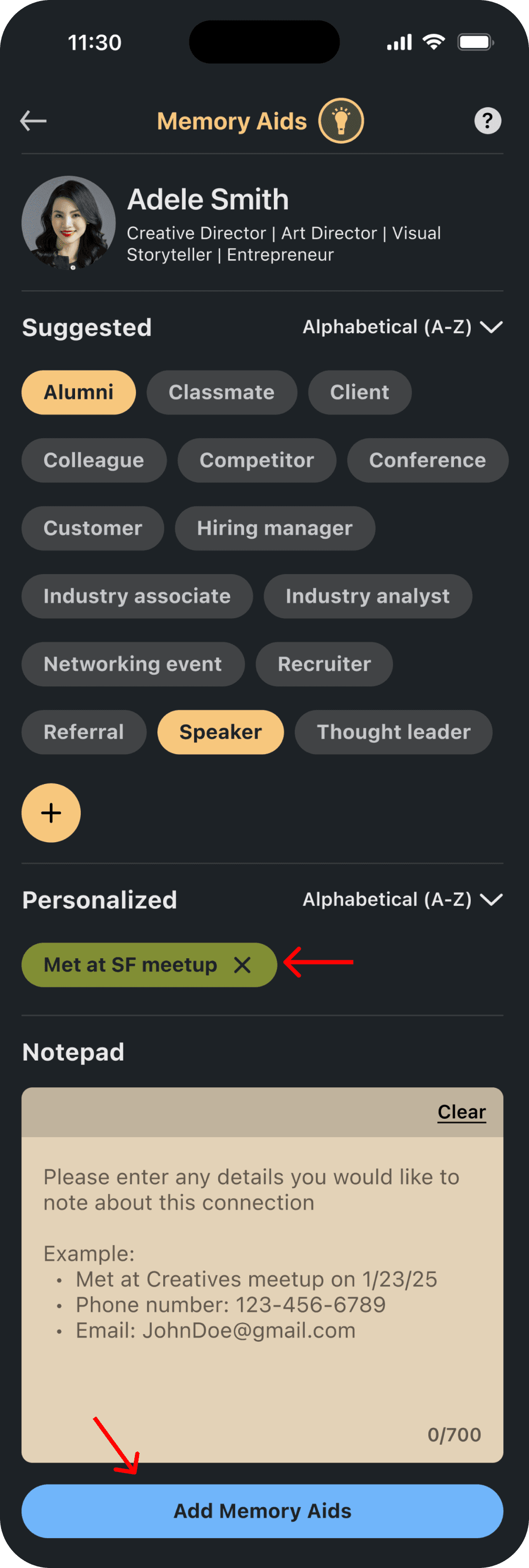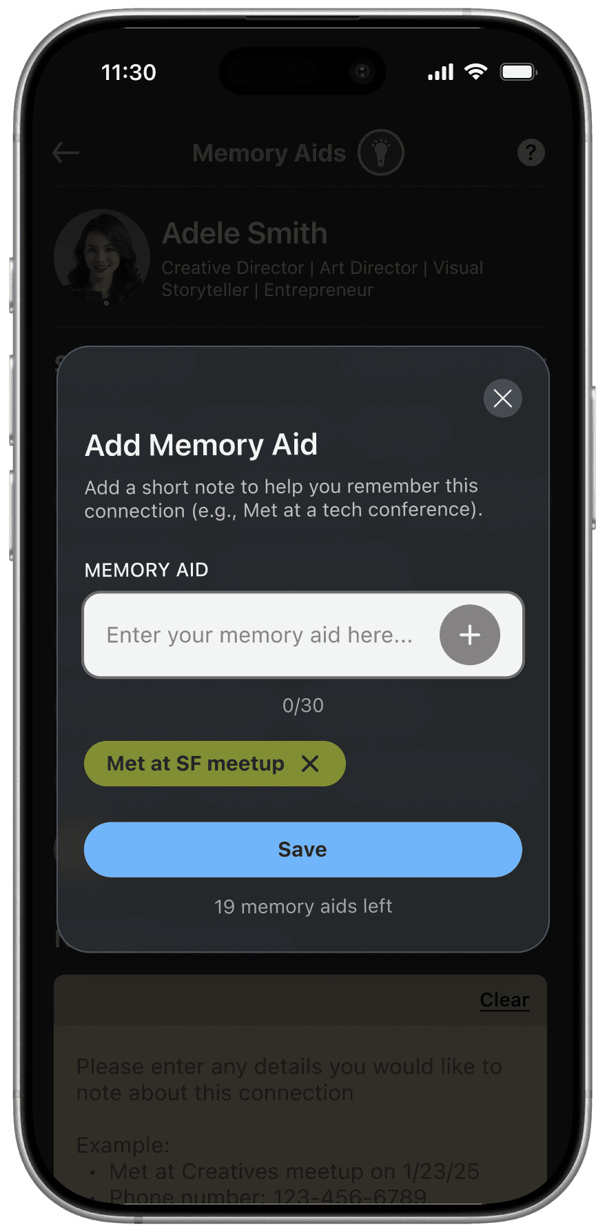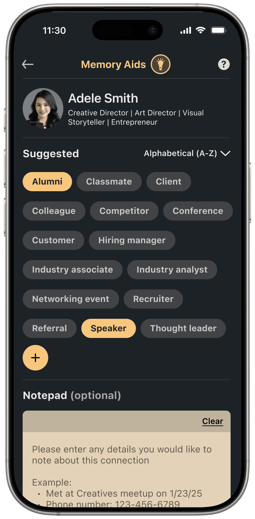 Choose from suggested Memory Aids or create your own to capture quick context about a connection.