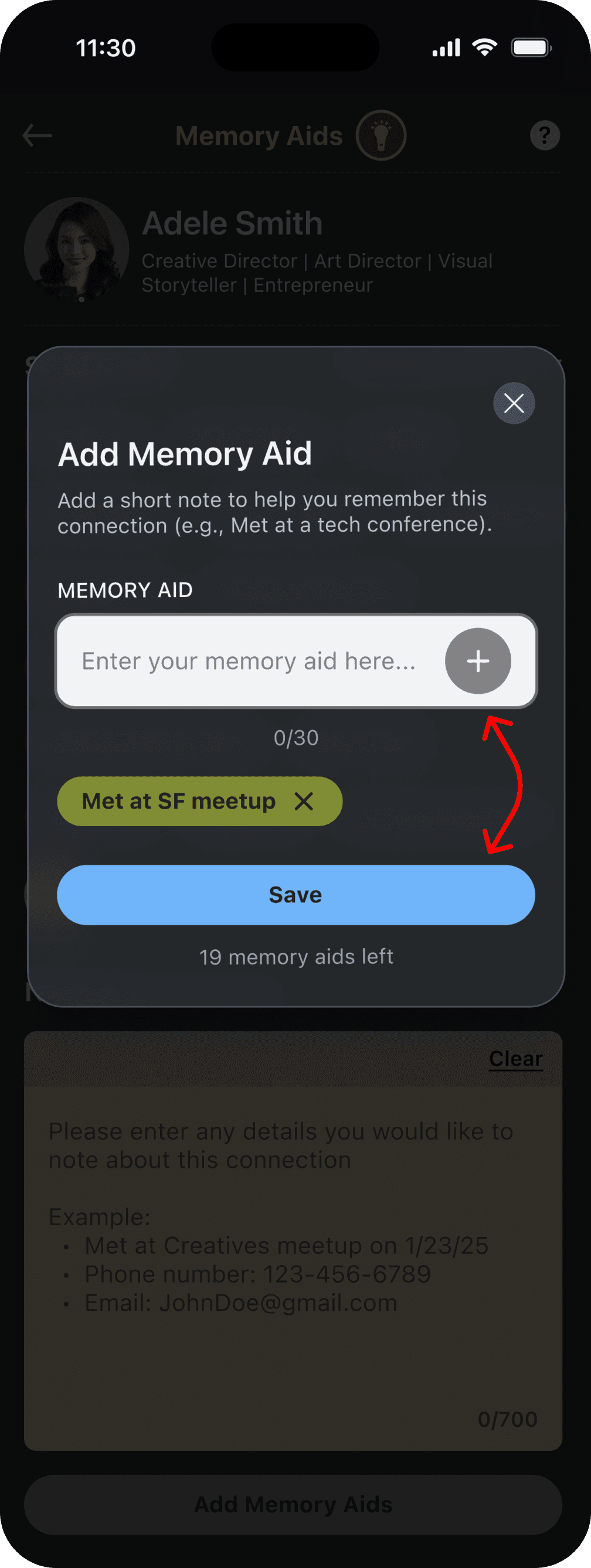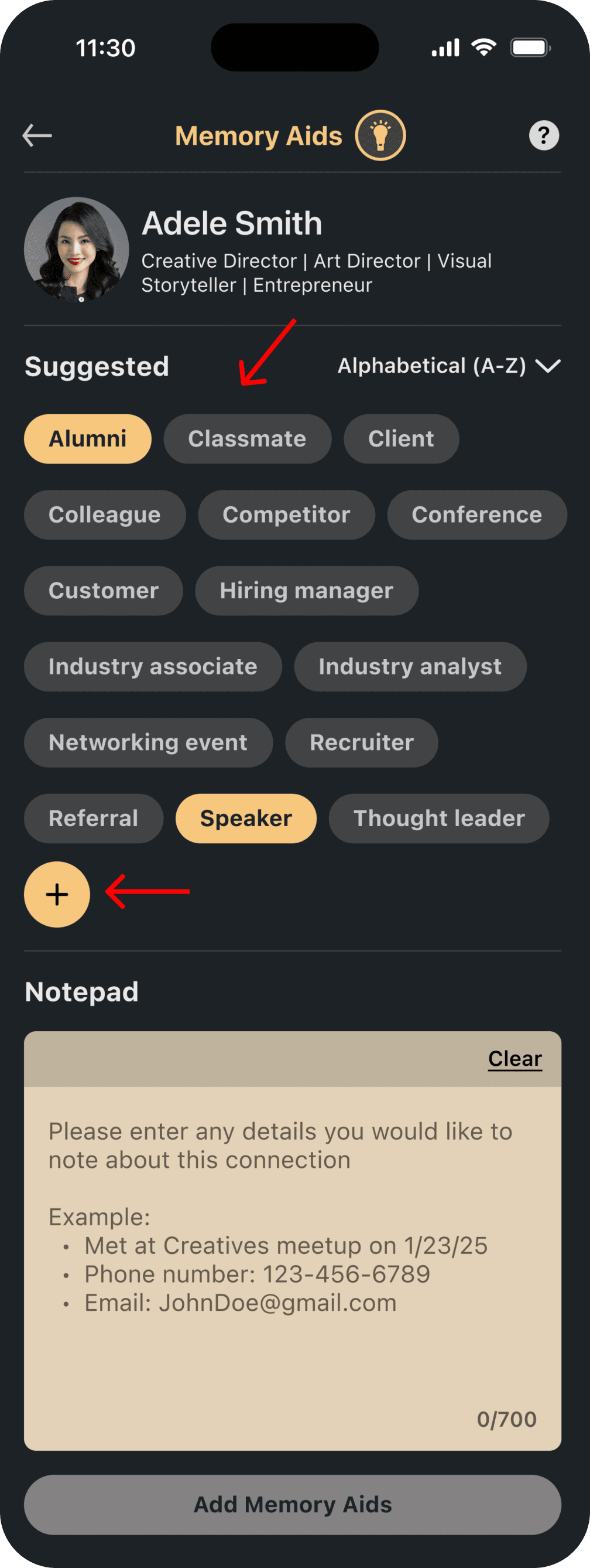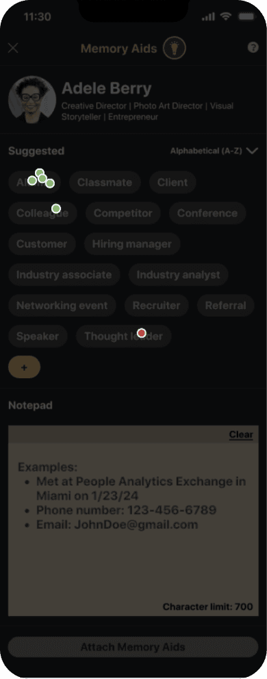 Choose from suggested Memory Aids or create your own to capture quick context about a connection.