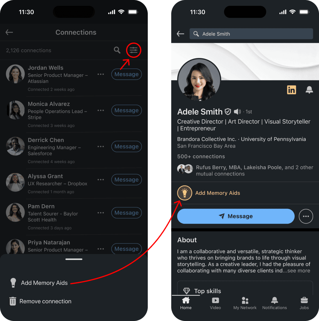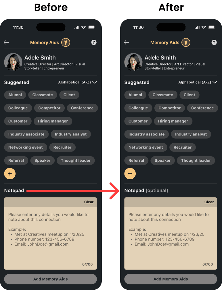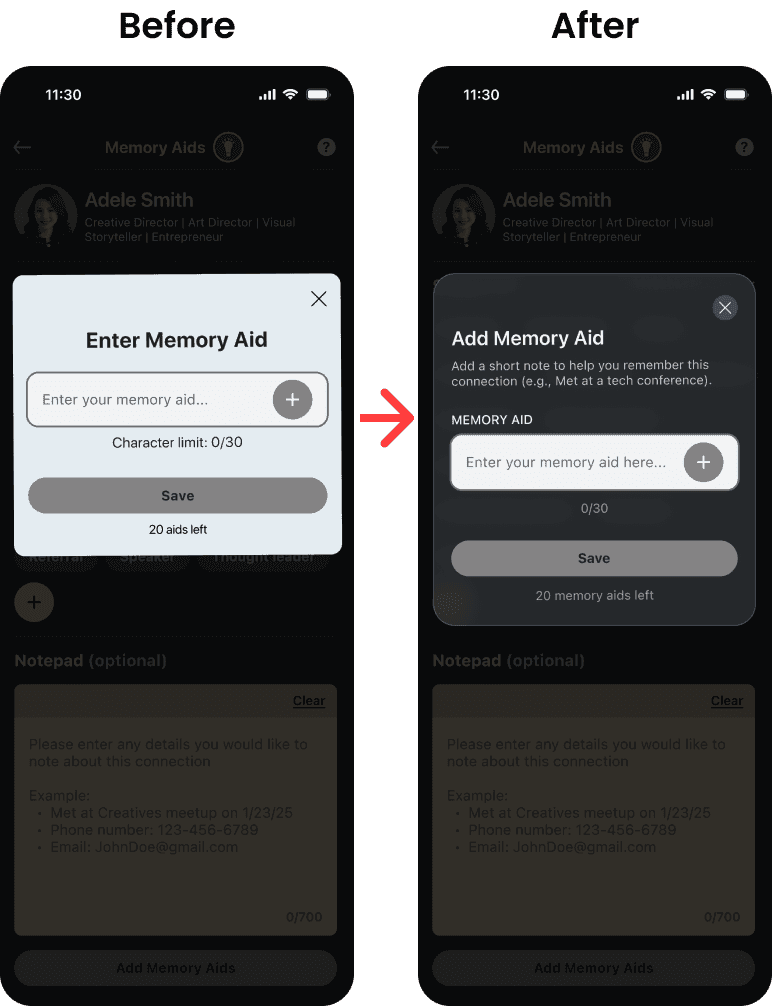 Moving Memory Aids from the connections list to profile pages aligned with where users naturally look for context, making the feature more intuitive and reducing friction.