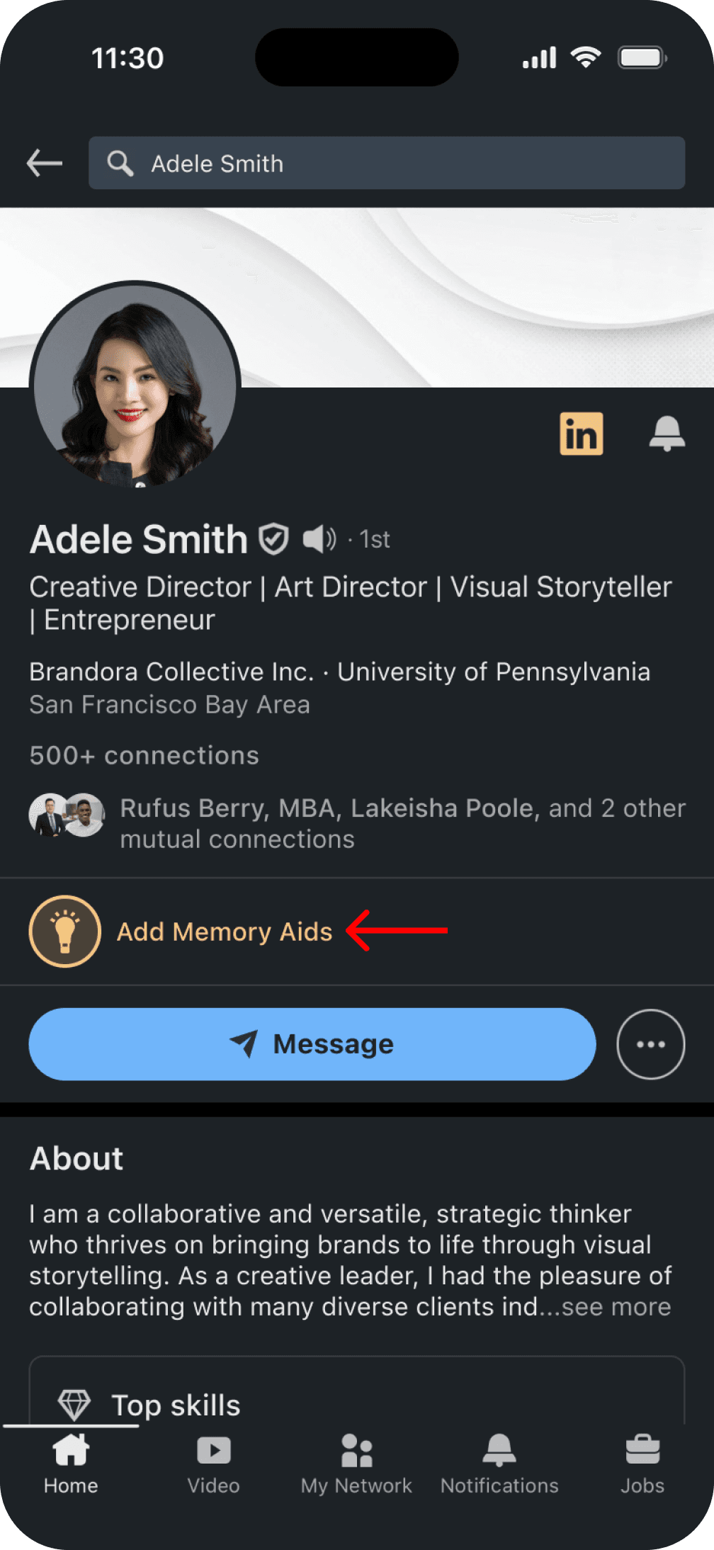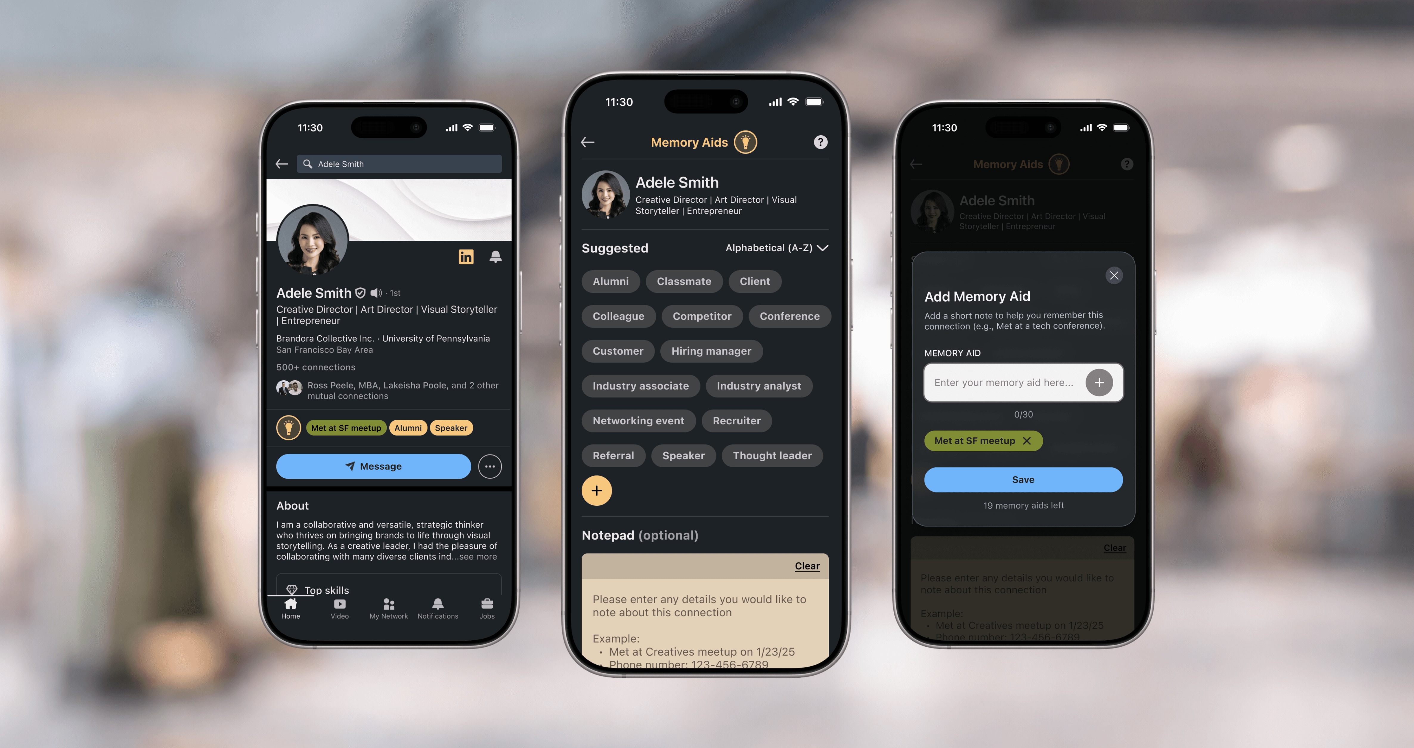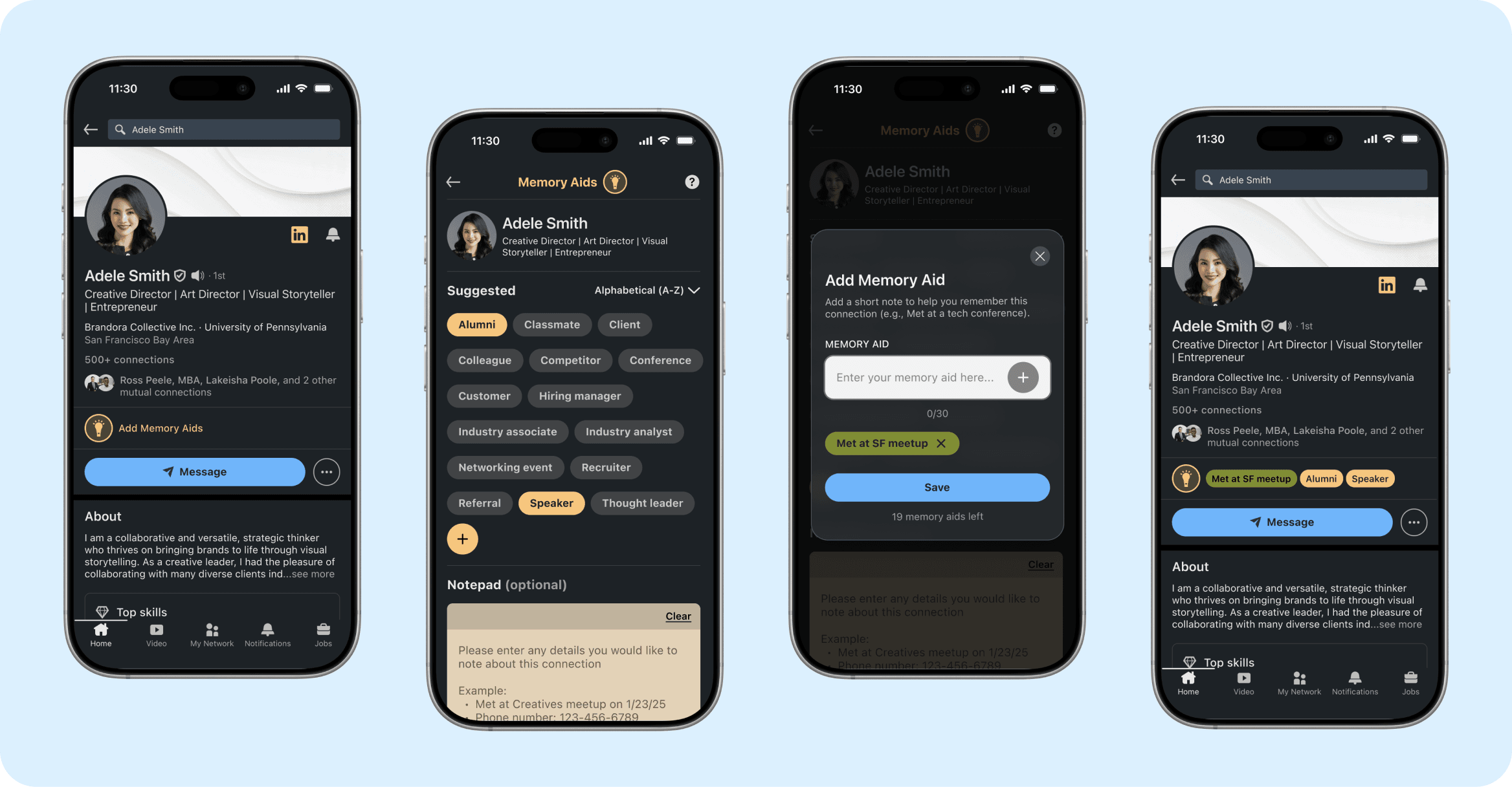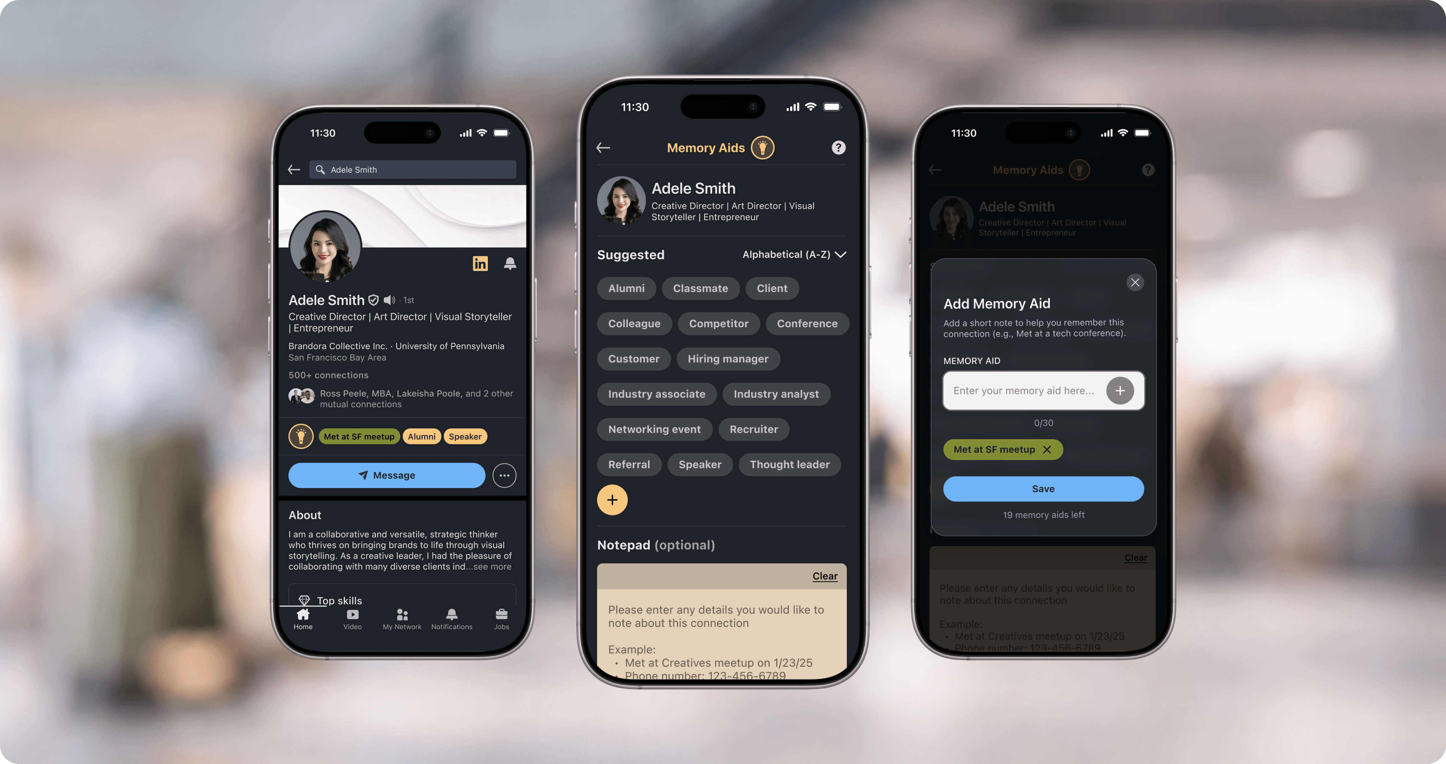 Memory Aids is a self-initiated feature concept for LinkedIn’s mobile app that lets users attach short tags (30 characters or less) such as “Met at meetup” or “Referred by Ana” directly to a profile. These glanceable notes provide just enough context to help users reconnect confidently, reach out intentionally, and navigate large networks with ease.