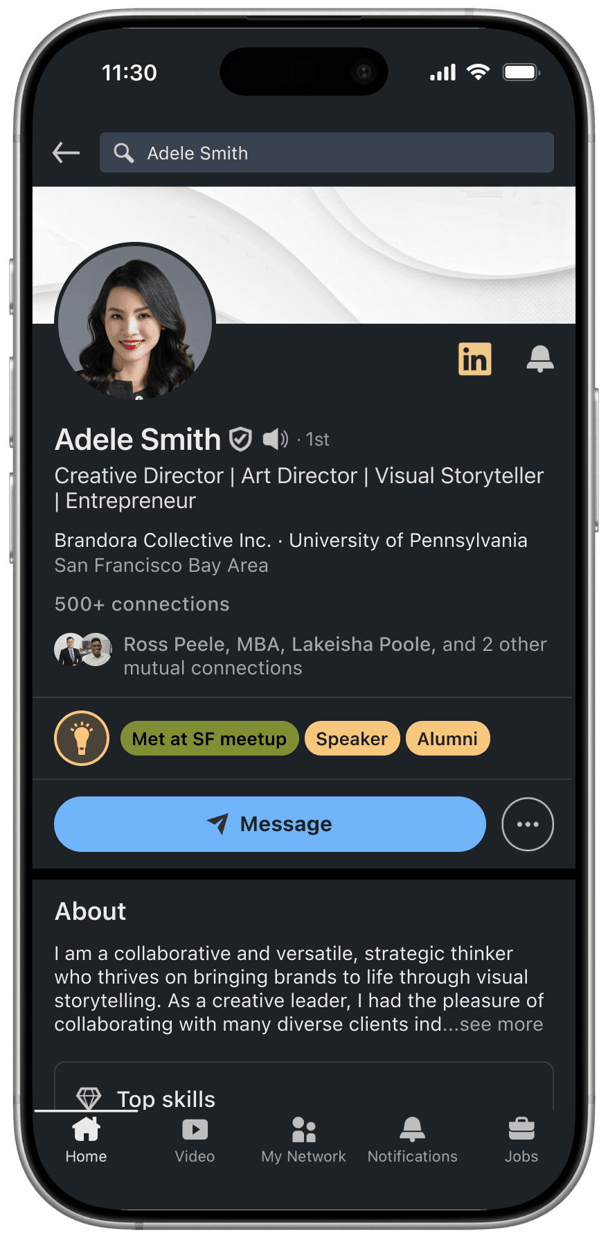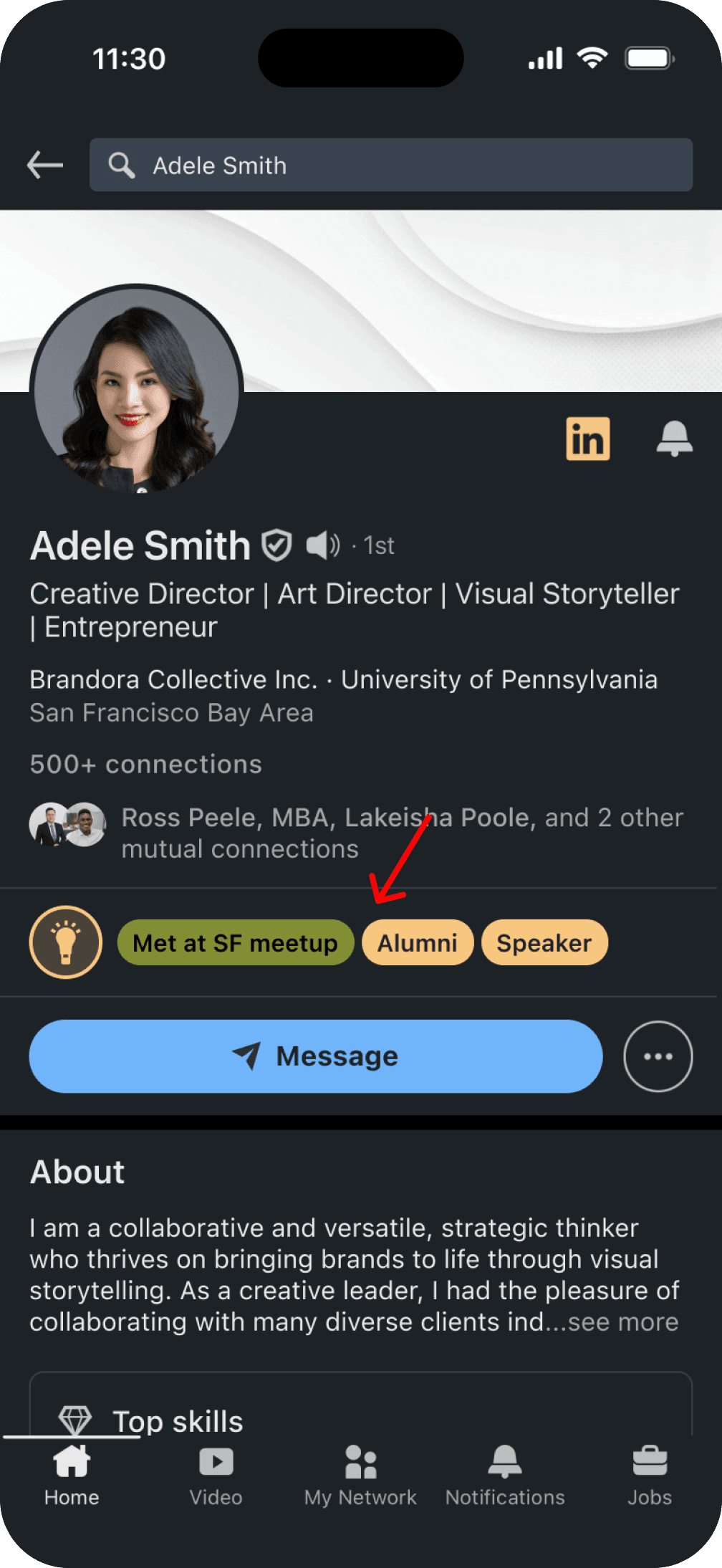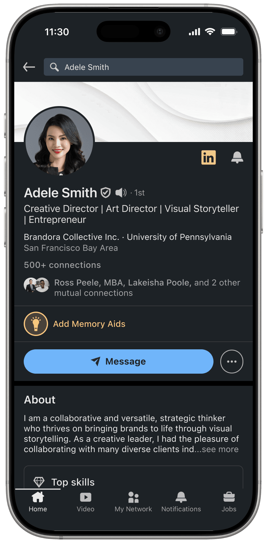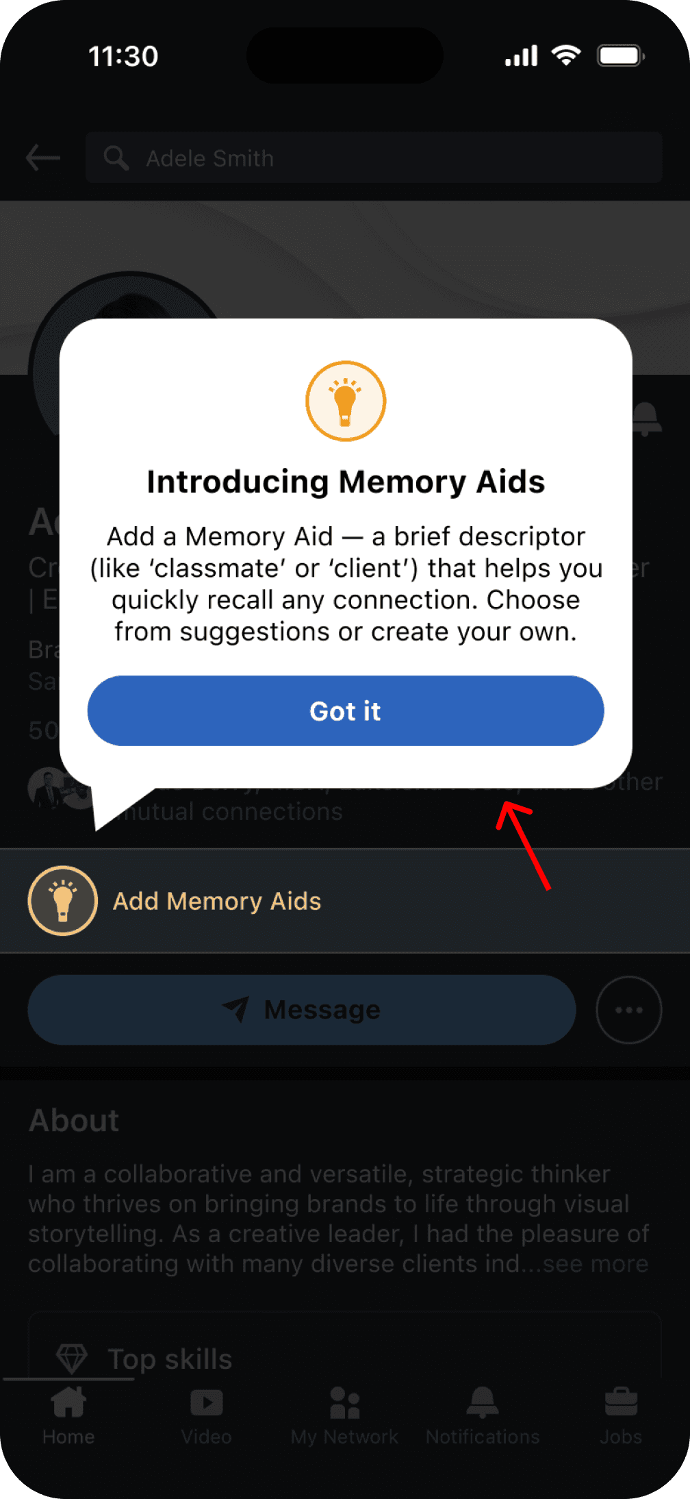 Memory Aids is a self-initiated feature concept for LinkedIn’s mobile app that lets users attach short tags (30 characters or less) such as “Met at meetup” or “Referred by Ana” directly to a profile. These glanceable notes provide just enough context to help users reconnect confidently, reach out intentionally, and navigate large networks with ease.