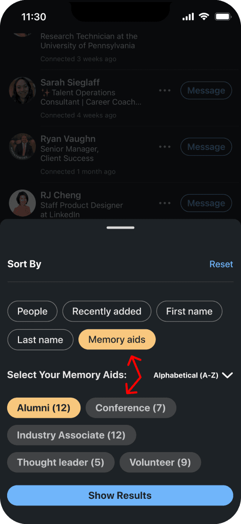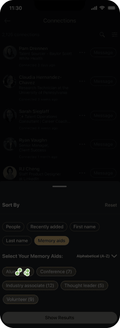 Filter your connections list by the Memory Aids you’ve added to quickly surface people by shared context.