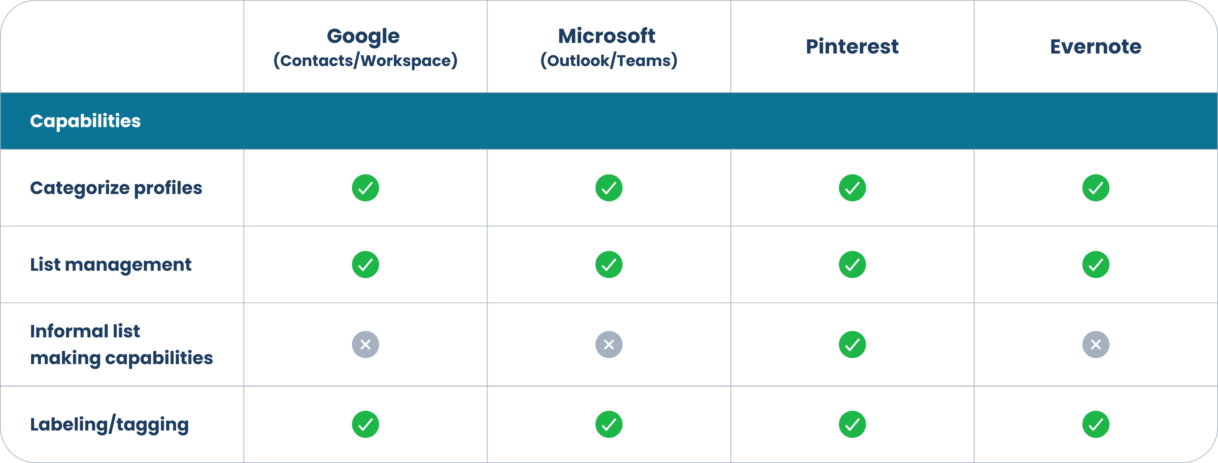 To explore this hypothesis, I analyzed four indirect competitors that support tagging, sorting, and/or tracking contacts, looking for organizational patterns that could shape interview questions and early feature ideas.