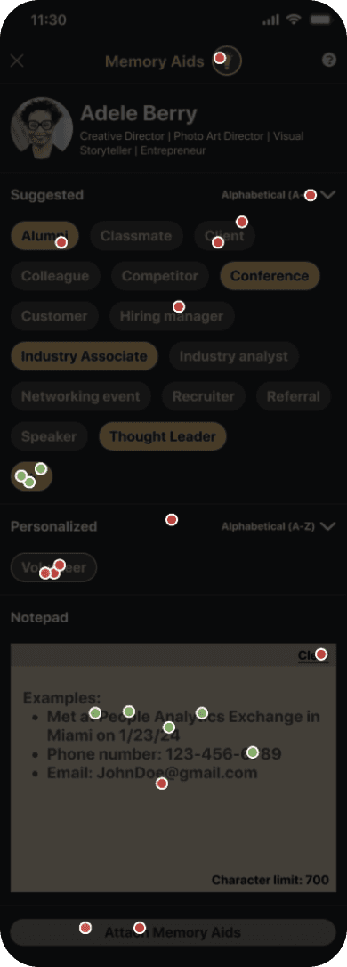 Synthesizing interview data surfaced a clear priority: users were struggling to remember who people were in their network. This insight shaped the direction of the solution and inspired the concept of short, glanceable “Memory Aids,” a lightweight tagging system designed to support both recall and organization.