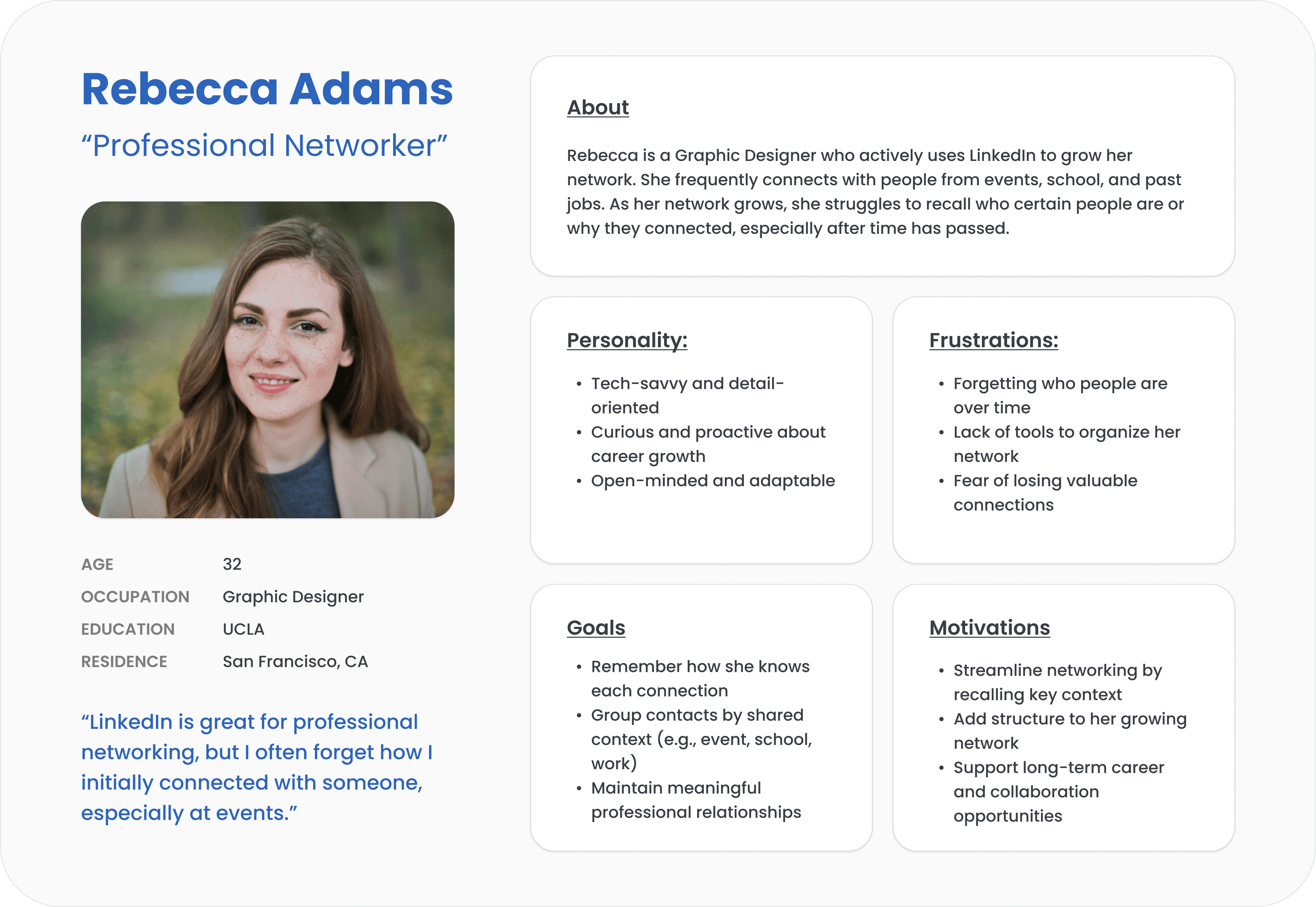 To translate the research insights, I created a persona who frequently adds new connections but often forgets how she knows them. Rebecca values relationship-building but needs quick cues to jog her memory. Her needs validated the value of a memory-jogging feature and shaped how users would access and interact with it.