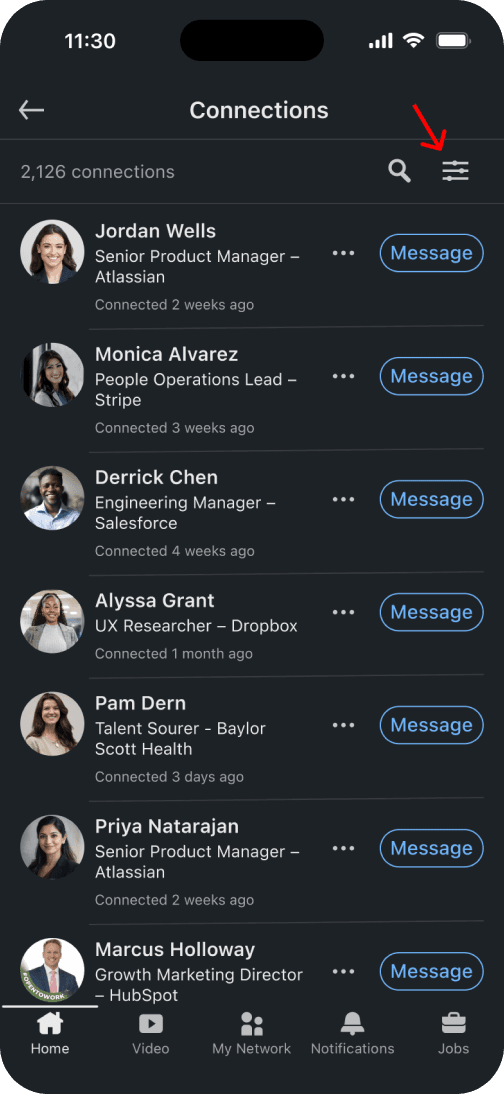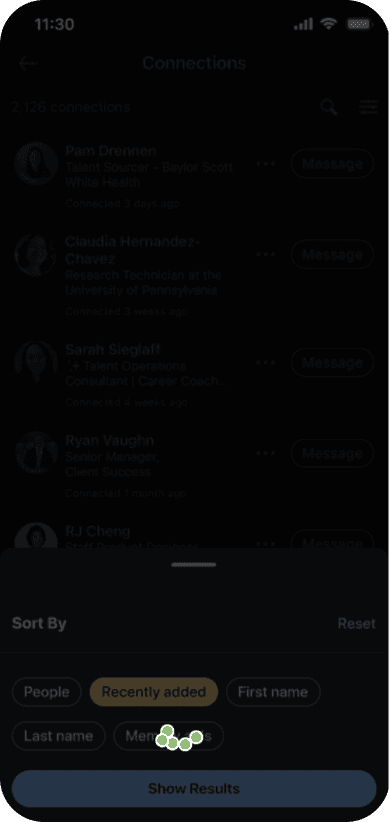 To make Memory Aids actionable, I added it as a new filter within LinkedIn’s Sort By menu on the connections page. Tapping the sort icon opens a bottom sheet where users can choose one or more Memory Aids and instantly see all connections linked to it. This aligns with research showing users want an easy way to group their network by shared experiences.