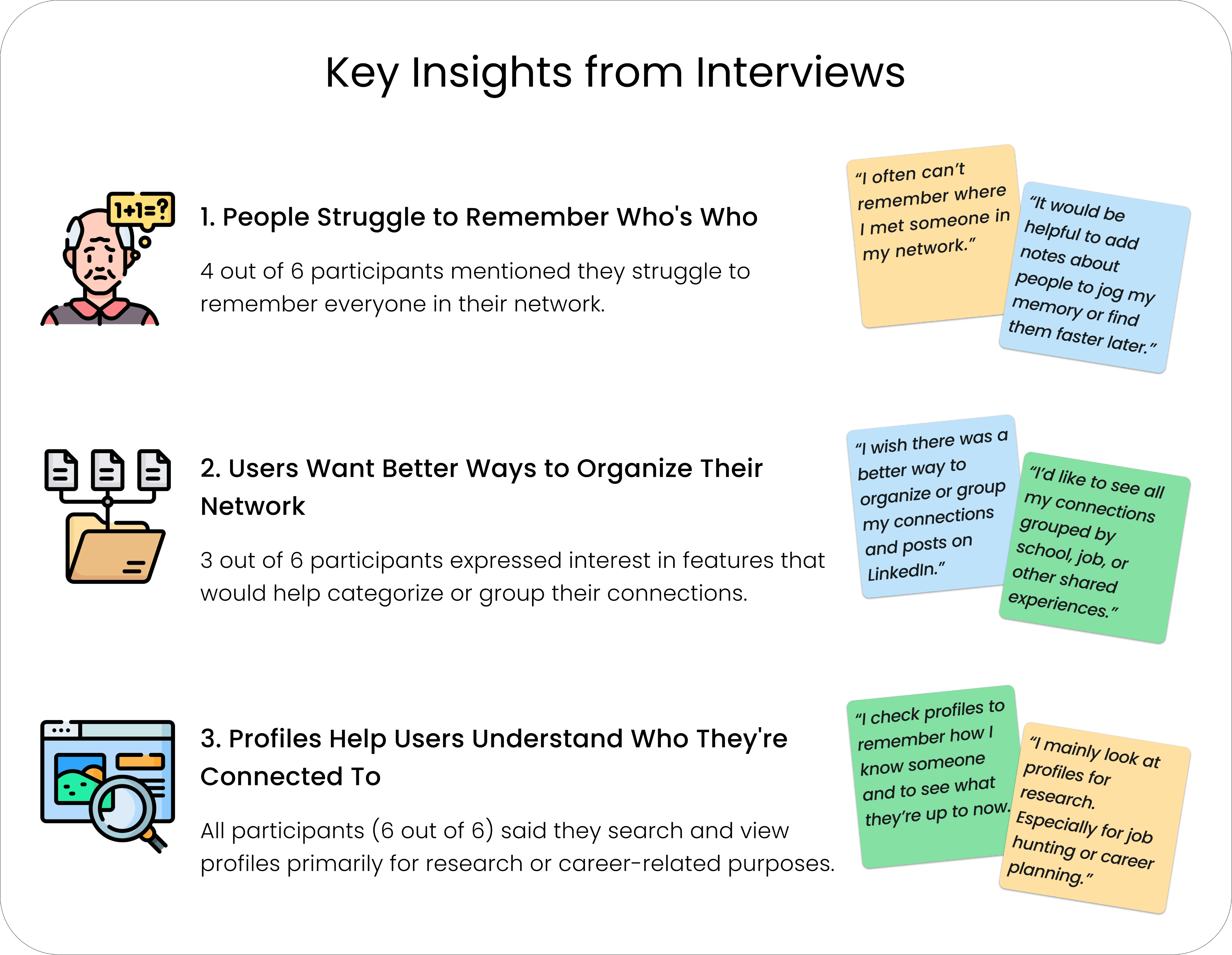 After competitive research, I interviewed six LinkedIn users (late 20s–50s) over Zoom. While the initial assumption was that they wanted better ways to organize their networks, the real challenge was simply remembering how they know the people in their network.
